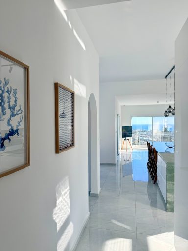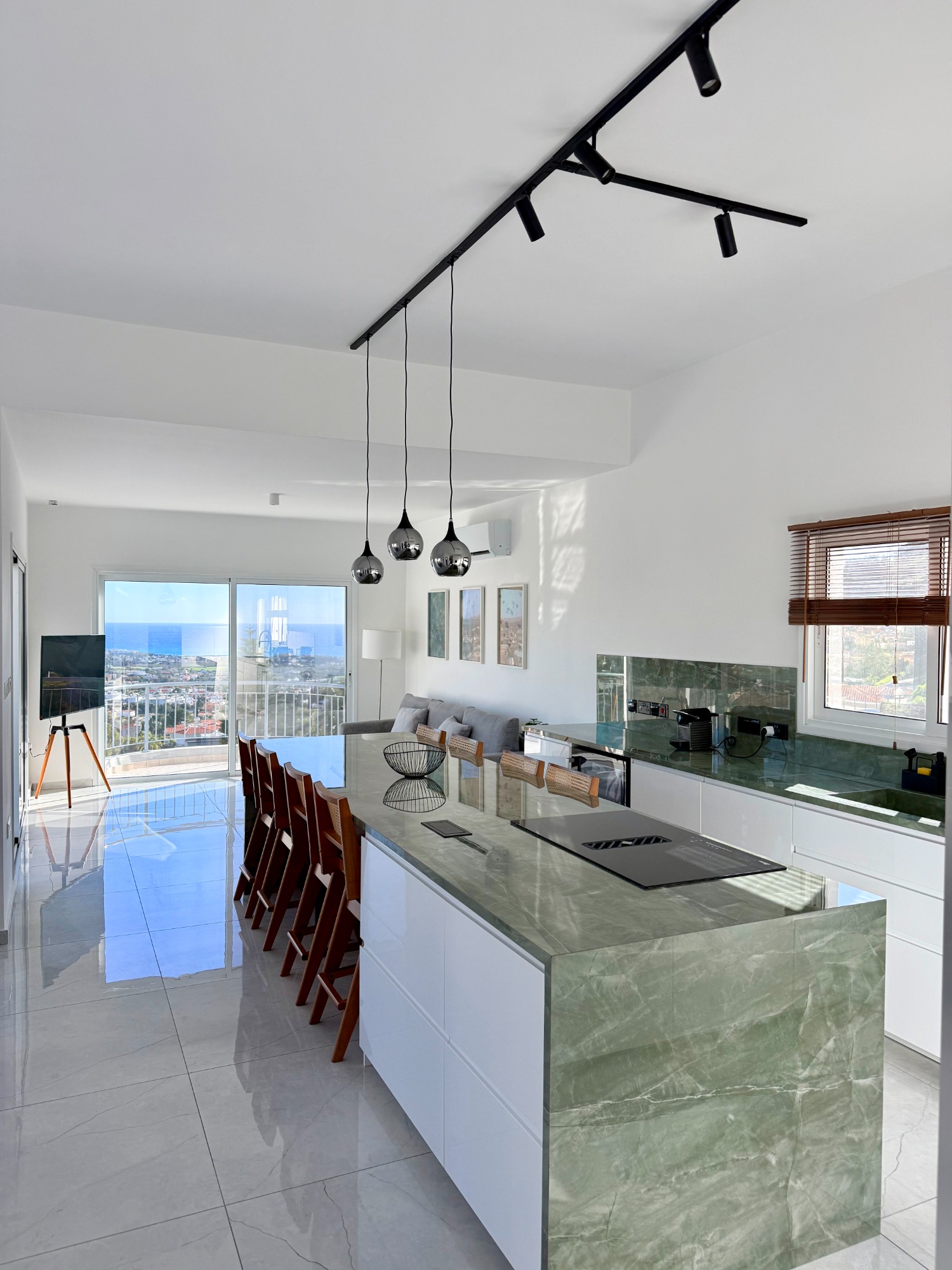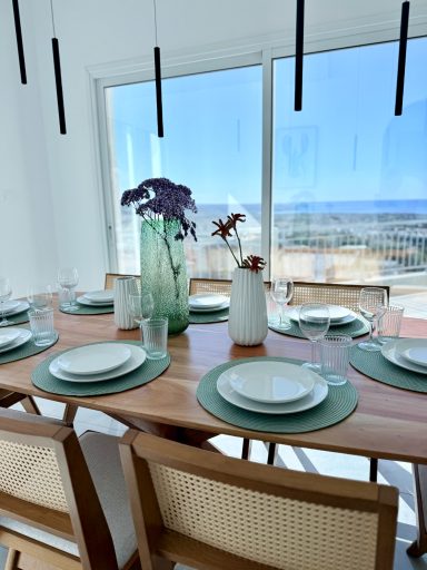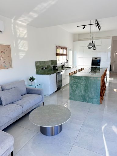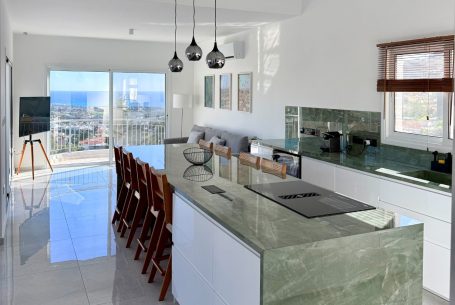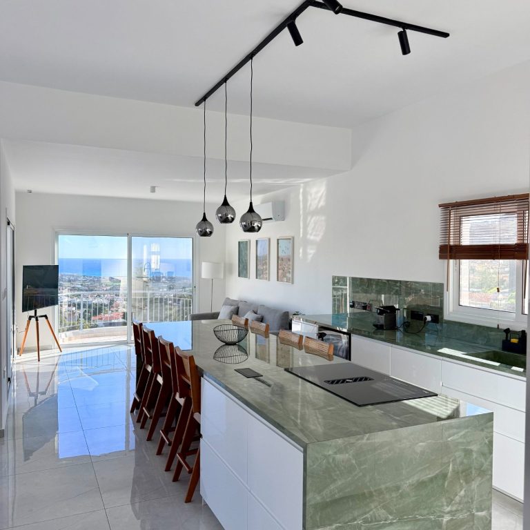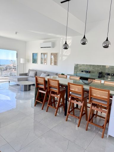 The 50 m² open-plan living area offers plenty of space for up to eight guests. A fully equipped modern kitchen with a waterfall island, elegant dining area, and wide verandas create the perfect place to gather and relax — all with breathtaking sea views of the Mediterranean.