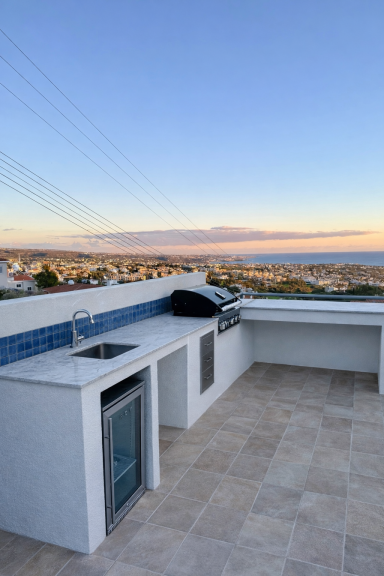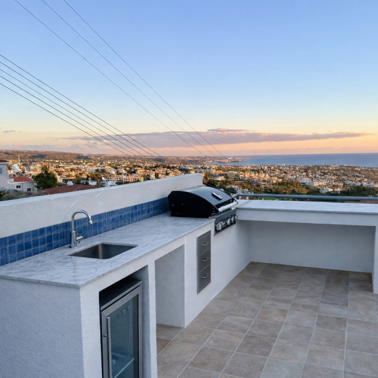 The villa’s outdoor kitchen offers the perfect setting for long Mediterranean evenings. Nestled beneath olive trees, it will feature seating for up to 10 guests, a BBQ, water connection, and refrigerator — all with a beautiful view over Coral Bay. The ideal place to gather, cook, and enjoy the Cypriot summer under the open sky.