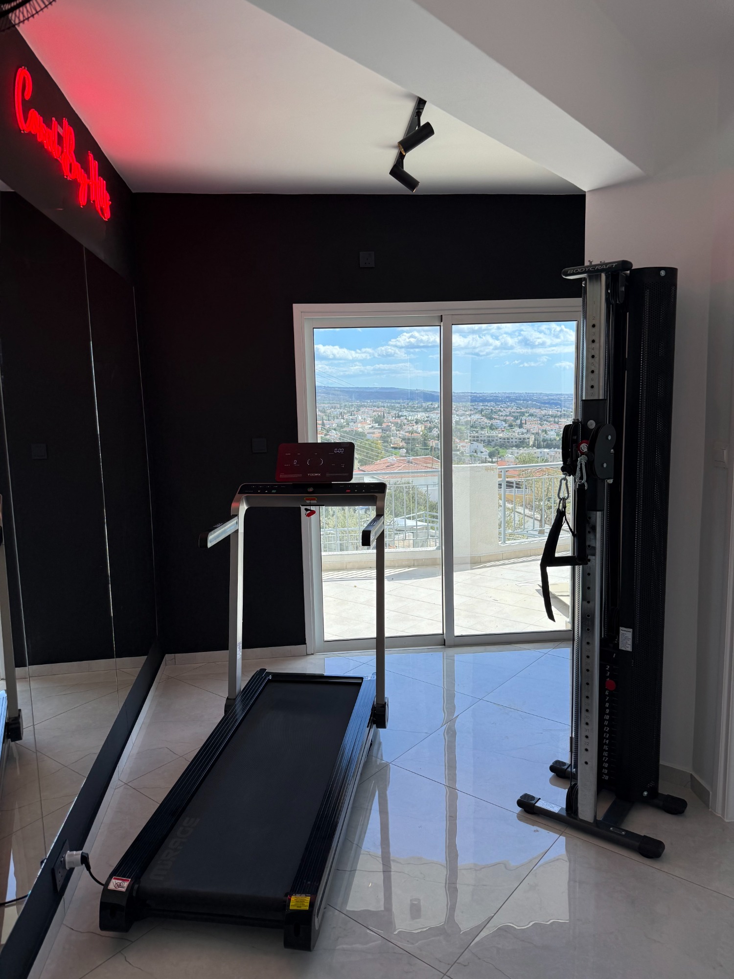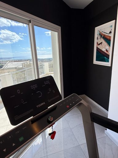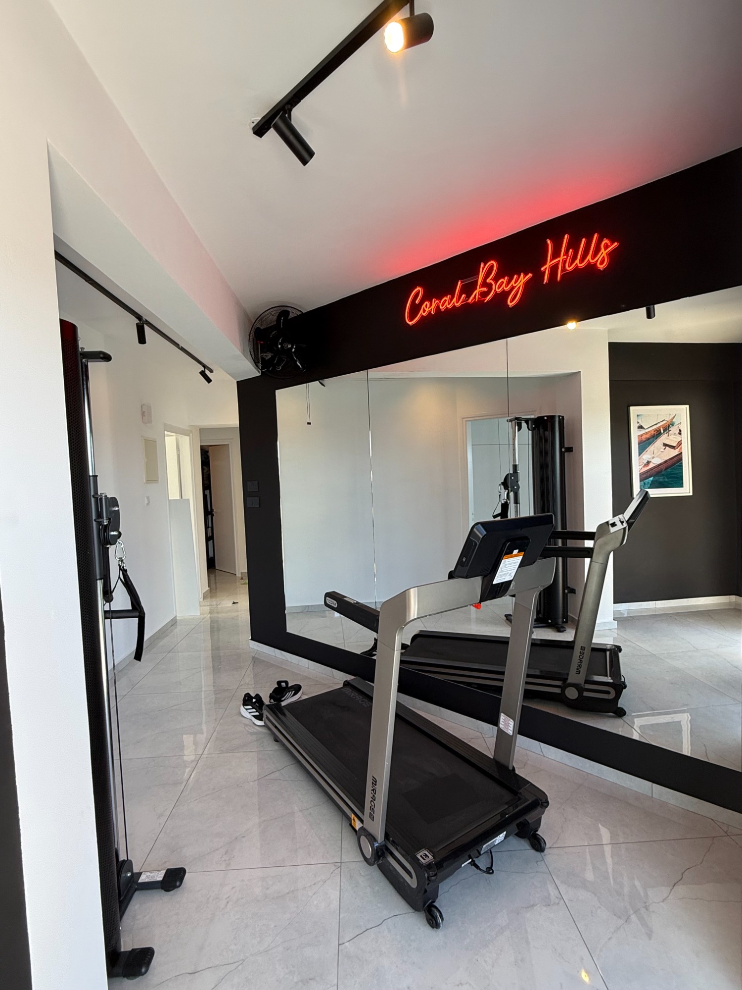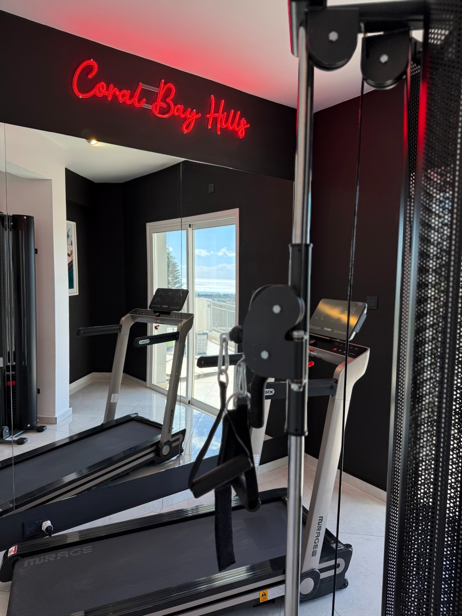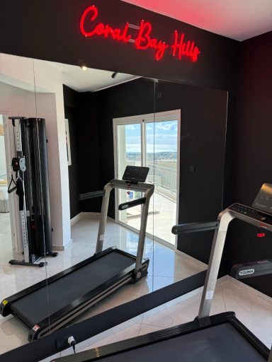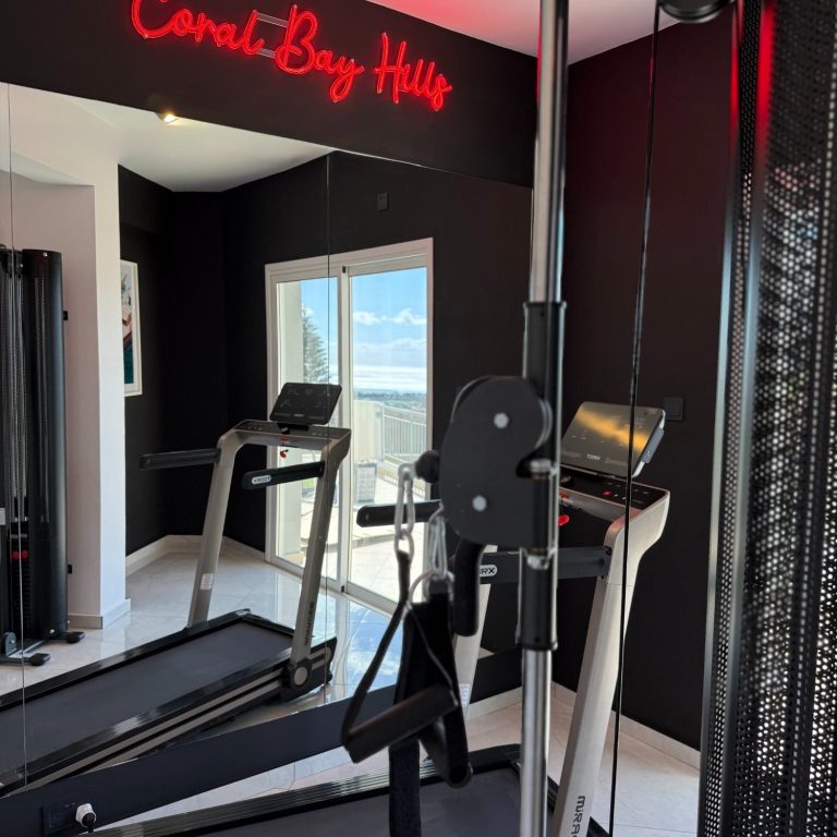 Stay active with a view. The villa’s private gym includes a treadmill and dual cable pull station, letting you work out while gazing over Coral Bay and the Mediterranean Sea — fitness with a breathtaking panorama.
