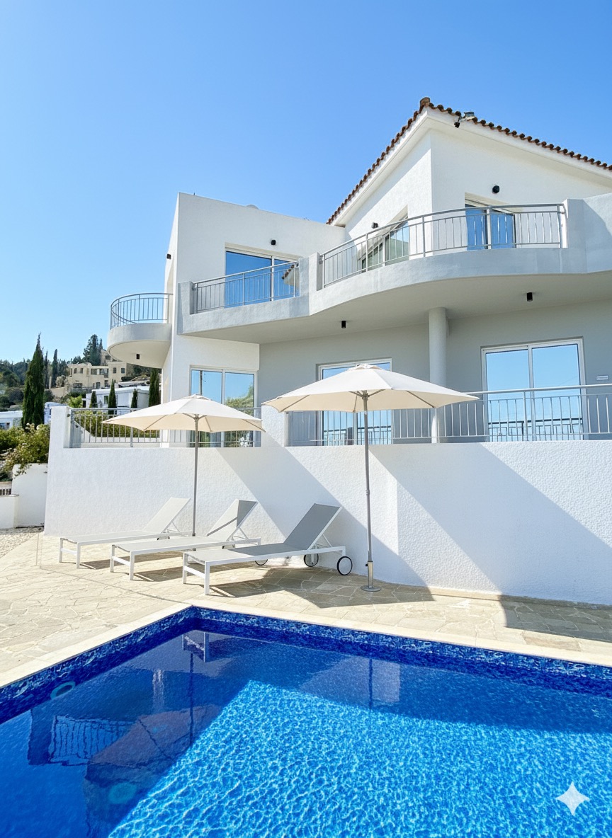 Welcome to our luxurious 4-bedroom villa overlooking the turquoise waters of Coral Bay, Cyprus! Perched on a peaceful hilltop, it offers panoramic 180° sea views from sunrise to sunset and a perfect blend of privacy and indulgence.